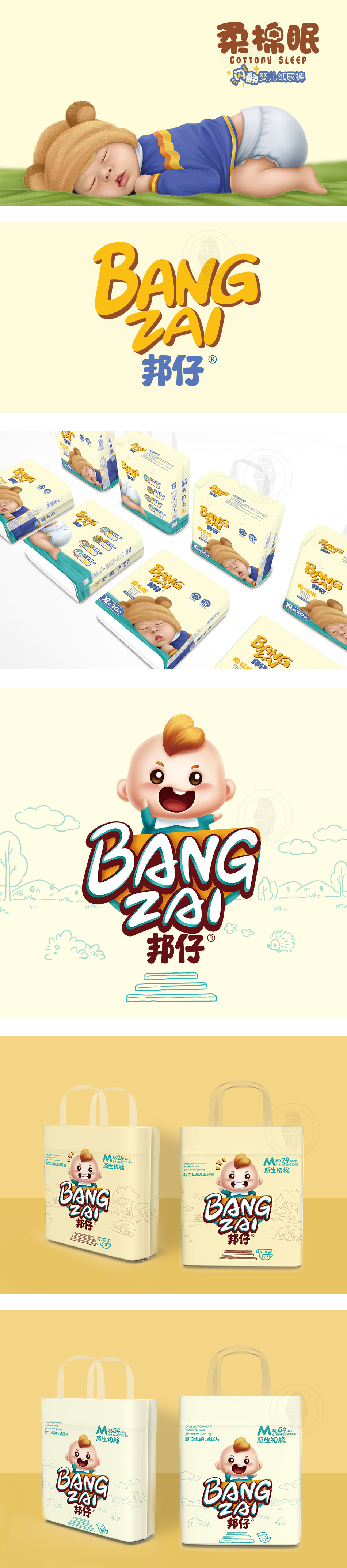 服務方案:通過對邦仔品牌理念滲透,塑造一個優質健康的嬰童幫護品牌形象,注重產品形象及終端物料設計,配套提升全品牌產品及視覺系統的質感和應用性,更貼合當前市場需求。