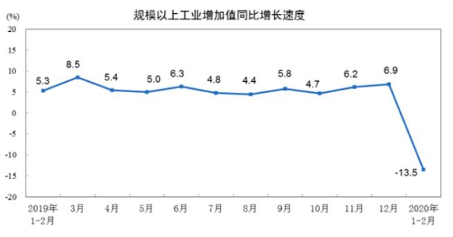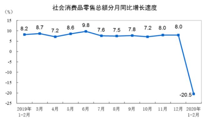 其中,消費方面,1-2月份,社會消費品零售總額52130億元,同比下降20.5%。