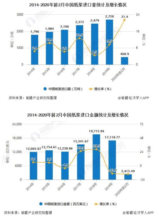 據(jù)中國海關(guān)總署統(tǒng)計數(shù)據(jù)顯示,2019年去年中國紙漿進(jìn)口量達(dá)到了2720萬噸,累計增長9.7%。截止至2020年1-2月中國紙漿進(jìn)口量達(dá)到468.9萬噸,相比上年同期增長了83萬噸,累計增長21.4%。