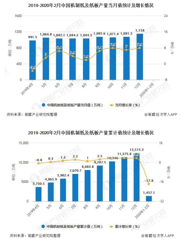 2020年1-2月中國機制紙及紙板產(chǎn)量超1400萬噸