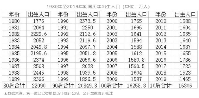 新生人口是母嬰行業基本盤中的基本盤。進入21世紀以來,這二十年間總共有多少人出生?隨著出生率逐年下降,00后和10后,相比80后和90后,究竟少了多少人?近日,第一財經根據歷年統計公報、公開數據統計梳理發現,我國80后、90后、00后、10后人數分別為2.21億、2.08億、1.63億(16258萬)、1.63億(16306萬)。