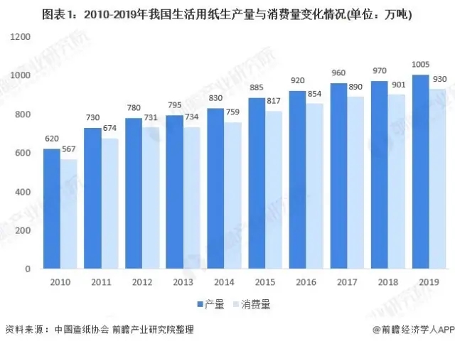 根據中國造紙協(xié)會在歷年《造紙工業(yè)年度報告》中披露的數據,2010-2019年我國生活用紙的生產量與消費量整體上呈現逐年增長的態(tài)勢。2019年,我國生活用紙產量為1005萬噸,較2018年增長3.61%;消費量為930萬噸,較2018年增長3.22%。