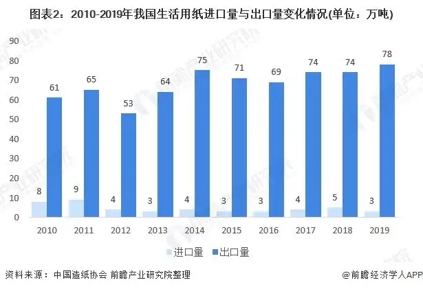 2010-2019年,我國生活用紙進口數量較少,出口數量整體上呈現波動增長態(tài)勢,出口量遠高于進口量。2019年,我國生活用紙進口量為3萬噸,較2018年減少了2萬噸;出口量實現78萬噸,較2018年增長了4萬噸。
