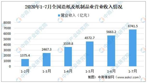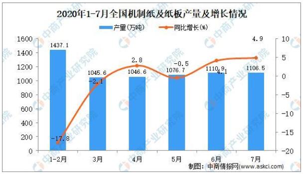 根據中國輕工業信息中心數據顯示,2020年1-7月,全國機制紙及紙板產量6843.8萬噸,同比下降3.3%。7月當月,全國機制紙及紙板產量1106.5萬噸,同比增長4.9%。