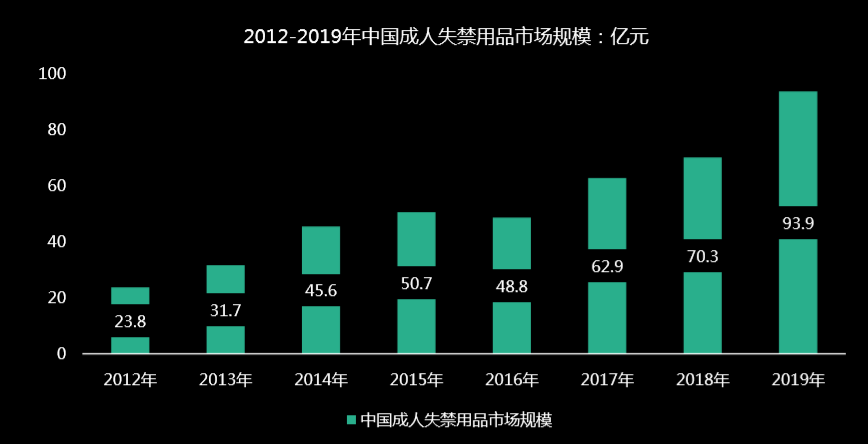 根據人口失禁發生率和人口結構估算,中國失禁的人數在2-3億人,按照每人正常使用片單數去核算,這個群體的失禁用品規模應該是現在實際的4-5倍(2019年中國成人失禁用品市場規模為93.9億元),這還是保守估算的結果。