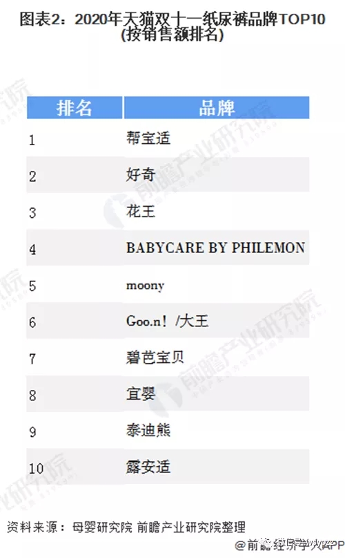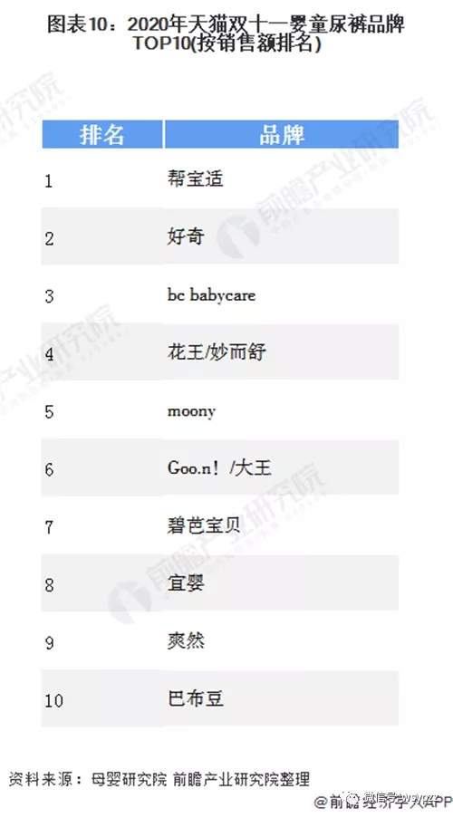 作為母嬰領域剛需、高頻的消費類目,紙尿褲需求量巨大,由于父母對于嬰幼兒健康愈發重視,消費者對于紙尿褲的品牌同樣重視。2020年天貓雙十一嬰童尿褲品牌TOP10中,幫寶適毫不疑問依然位居首位。