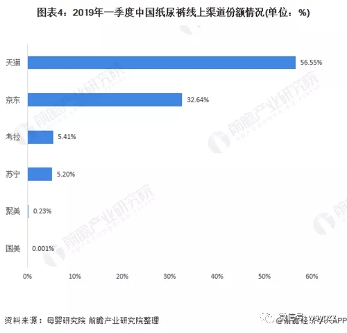 可見,線上渠道是紙尿褲銷售的重要渠道。2019年第一季度,紙尿褲銷售額達48.1億元,同比增長12.6%。其中天貓平臺保持其“一哥”優勢,銷售額27.2億元,占比56.5%。京東平臺銷售額15.7億元,占比32.6%,同比增長6.1%。在增長率上,考拉出現了20.2%的負增長,蘇寧實現了214.8%的超高速增長。.jpg)