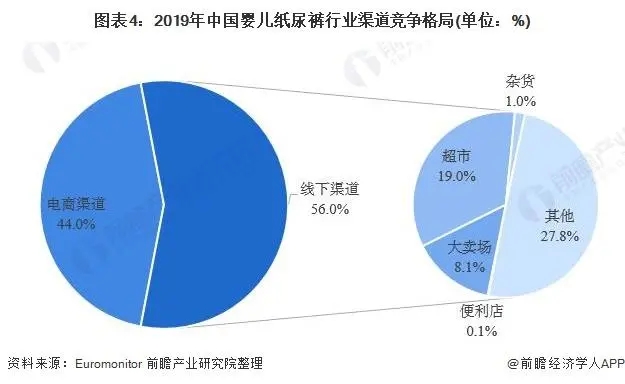 隨著互聯網以及網購的流行,電商渠道的銷售占比不斷提升,嬰兒紙尿褲電商渠道銷售占比從2010年的4.8%迅速增長至2019年的44%,而以超市、大賣場等為代表的線下渠道銷售額占比從2010年的95.2%減少至2019年的56%。