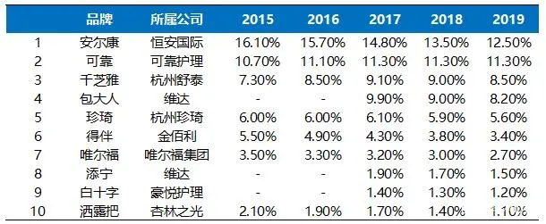 在企業數量上,2018年統計在冊的成人失禁用品生產企業有448家。本土廠商包括杭州可靠、恒安國際、豪悅護理等,外資廠商包括金佰利、尤妮佳等。目前成人失禁用品以國內品牌為主,2019年國內品牌恒安國際安爾康、杭州可靠、杭州舒泰千芝雅市占率分別為12.5%、11.3%、8.5%,占據前三。