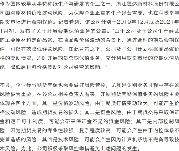 近期紙漿期貨價格已經站穩6000元/噸關口,不斷突破上市以來的新高。隨著原料價格波動的加大,紙廠套保需求顯著增加。面對困難的形勢,一些企業通過套保操作,不僅實現了業績穩定,業務規模還逆勢增長。