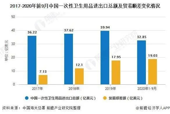 我國(guó)一次性衛(wèi)生用品進(jìn)出口規(guī)模不斷增長(zhǎng),2019年達(dá)到39.94億美元,同比增長(zhǎng)6.17%,增速進(jìn)一步加快。2020年前三季度進(jìn)出口規(guī)模達(dá)到32.85億美元,貿(mào)易順差額達(dá)到19.03億美元,超過(guò)2019年全年。