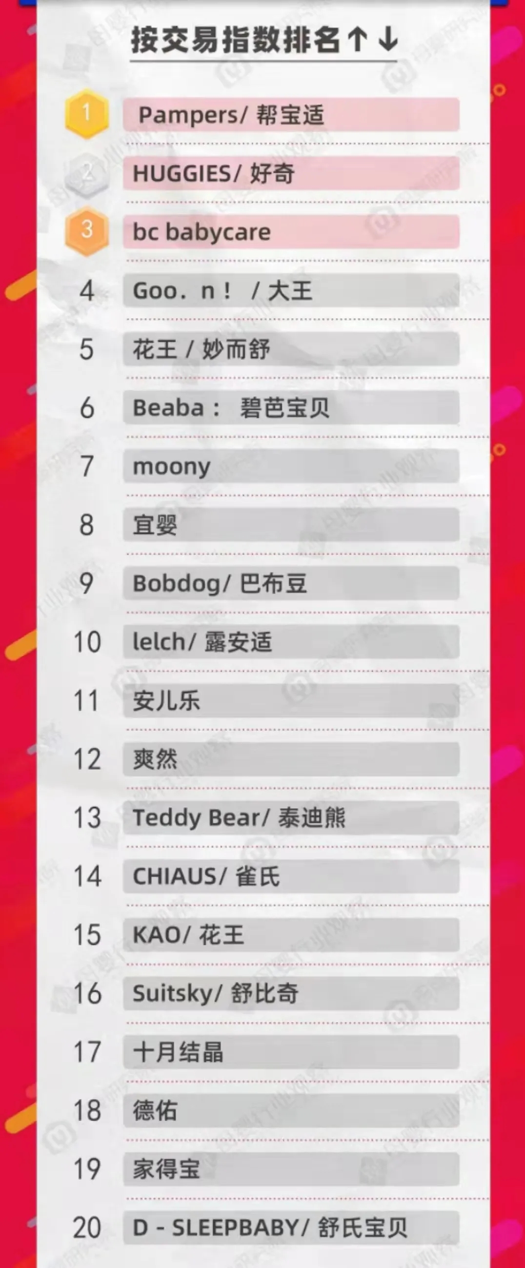 以上榜單是截止到今天早上9點(diǎn),雙十一紙尿褲終極排名榜單晚上12點(diǎn)才會(huì)揭曉,最終榜單如何,大家拭目以待吧!