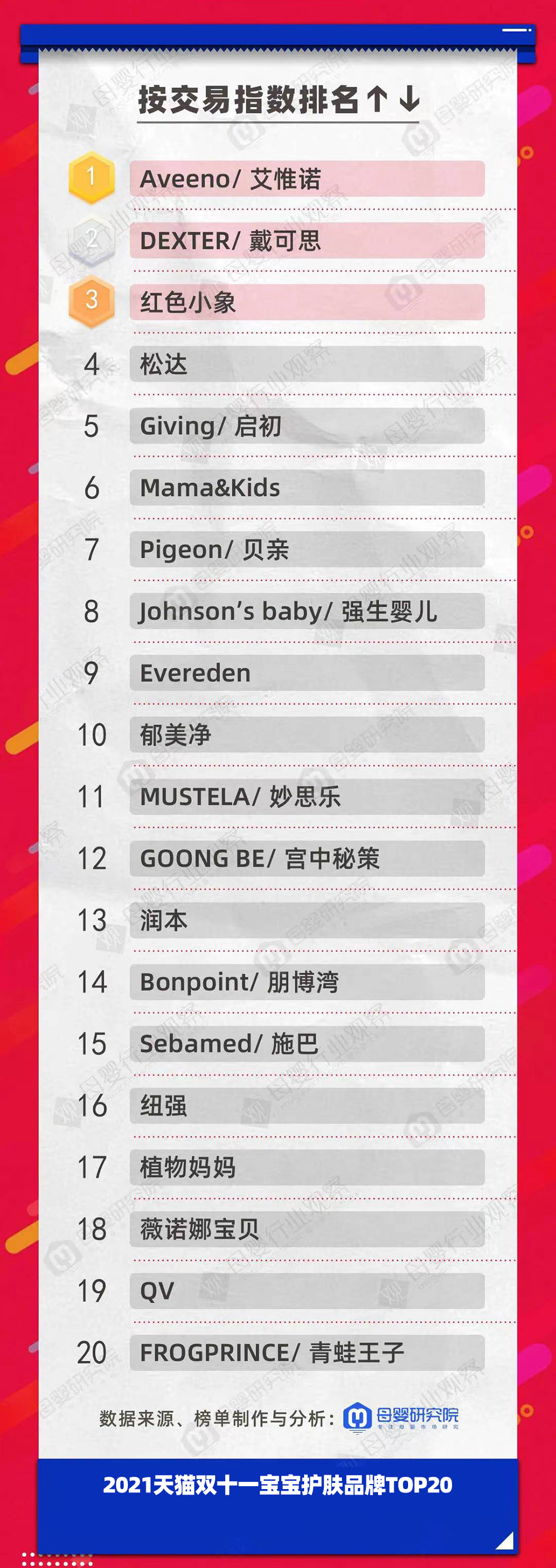 寶寶護(hù)膚品牌的Aveeno艾維諾、DEXTER戴可思以及紅色小象問(wèn)鼎品類(lèi)TOP3。上一年度雙11的品類(lèi)前三分別為Aveeno艾維諾、紅色小象和松達(dá)。