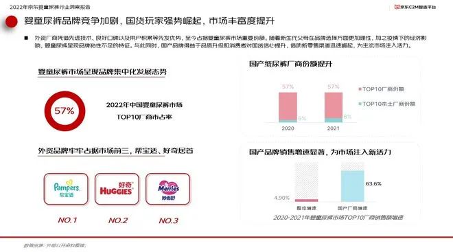 面對市場空間的變化,國內嬰童尿褲品牌競爭加劇。其中外資廠商憑借先進技術、良好口碑以及用戶積累等先發優勢,至今占據嬰童尿褲市場重要份額。而一方面,隨者新生代父母在品牌選擇方面更加理性,加之疫情下的經濟影響,嬰單尿褲也呈現出品牌粘性不足的特征。與此同時,得益于品質升級和消費者對國貨信心的提升,國貨品牌借助新零售渠道迅速崛起,為主流市場注入活力。報告顯示,本土頭部廠商份額從2020年的5%迅速提升至2021年的8%,而國產廠商銷售額年增速則達到63.6%,遠超行業整體增速的4.9%。