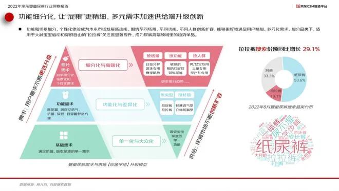 在產品細分賽道方面,功能和場景細分、個性化體驗成為未來市場發展新動能。圍繞不同場景、不同功能、不同人群創新擴容,能夠更好地滿足用戶精細、多元化的需求。細分品類下,適用于大齡寶寶運動和穿脫自由的“拉拉褲”關注度顯著提升,成為高端尿褲領域里的趨勢單品。報告顯示,2022年8月,“拉拉褲”關鍵詞搜索份額同比提升29.1%。讓“屁糧"更精細,多元需求加速供給端升級創新。