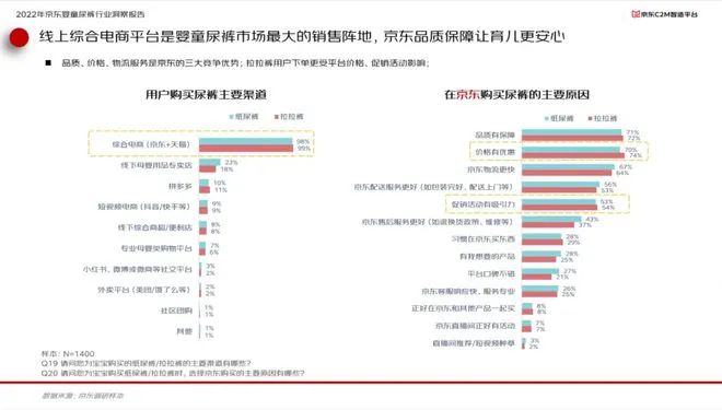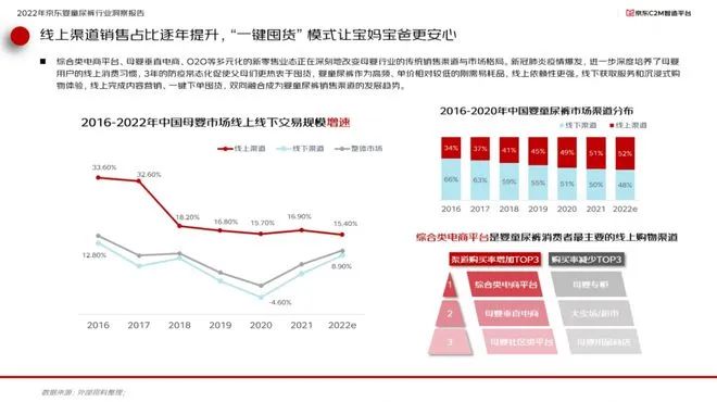 報告顯示,2022年中國嬰童尿褲市場渠道分布上,線上渠道占比已經超過線下渠道達到52%,而以京東為代表的綜合類電商是嬰童尿褲消費者最主要的線上購物渠道。