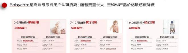 報告還對國產母嬰用品品牌Babycare進行了解析,發現該品牌的超高端紙尿褲用戶認可度高,無論是0-6個月,還是7-12個月,以及1歲之后階段,Babycare超高端紙尿褲都是用戶品牌偏好榜首。而且隨著嬰童長大,寶媽對產品價格敏感度降低,Babycare超高端紙尿褲成為了諸多寶媽的首選產品。